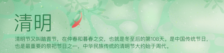 在我國的傳統中,清明踏青的內在意義還在于順應時令節氣。陽春三月,生氣始盛,人們走出屋門,來到野外,主動地迎合時氣,促進自身體內的陽氣流轉,對身體大有裨益。 清明節又叫踏青節,在仲春與暮春之交,也就是冬至后的第104天。是中國傳統節日,也是最重要的祭祀節日之一,是祭祖和掃墓的日子中華民族傳統的清明節大約始于周代,距今已有二千五百多年的歷史。