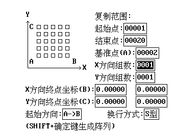 復制范圍:需要復制的圖形的起始加工點號和結束加工點號。 基準點A:需要復制的圖形上的某個參考點,教導XY方向間距時需要以 該點為基準,默認為選擇圖形的第一個點。 X方向組數:陣列的X方向組數。 Y方向組數:陣列的Y方向組數,只復制一次則將XY方向組數均設成1。 X方向終點B坐標:該坐標必須是X方向最后一組對應基準點A的坐標。 可直接按教導按鈕將當前坐標教導進去。 Y方向終點C坐標:該坐標必須是Y方向最后一組對應基準點A的坐標。 可直接按教導按鈕將當前坐標教導進去。 起始方向:是先由A到B還是先由A到C。 換行方式:有S形和Z形兩種,Z形換方式當加工完一行后會返回到起始 點開始加工下一行,S形換行則不會返回起始點而是以直接折回的方式 加工下一行。 按下定位鍵可定位到基準點。 東莞市金裕自動化機械設備有限公司成立于2000年,金裕坐落于東莞市大嶺山向東工業區,創辦硅膠、PVC商標禮品生產設備.金裕研發的全自動全自動點膠機、矽膠機、油壓機、KPU鞋材機以及終于實現了的智能無人車間生產流水線,金裕的自動化設備可以做到讓你省人、省電、省管理。金裕公司歡迎新老顧客來訪,選擇金裕,沒有顧慮。www.rhqgw.cn |
