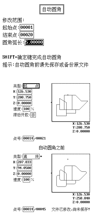 點膠機-高級編輯功能-自動圓角3)圖形平移 該功能主要用來統一調整圖形的XY坐標位置。先確定好圖形的起點,再將XY坐標移動到該起點需要移動的XY坐標位置,調用該功能后,整個圖形自動平移到當前位置。該功能也可在文件編輯界面中按下Shift+小數點鍵調用。 4)圖形縮放 該功能主要用于統一放大和縮小XY的坐標值。與批量修改方式不同的是,該功能也會一起放大和縮小圓弧、橢圓的半徑。 5)Z軸深度 該功能主要用來統一調整圖形的Z軸坐標和針高。先確定好圖形的起點,再將Z軸移動到該起點需要調整的Z坐標位置,調用該功能后,整個圖形的Z軸坐標和針高都會根據當前Z坐標的值進行調整。該功能也可在文件編輯界面中按下Shift+負號鍵調用。(使用該功能時注意偏移后的針高不要超限,否則不能正常運行并產生超限錯誤) 6)抬針高度 該功能以相對于Z軸坐標的方式批量修改針高的值。 例如某點的加工點類型為“單點”,Z坐標為-70,如果將抬針高度設為30后,該點的針高被修改為:(-70+30)= -40。 7)批量刪除 先選定需要刪除的加工點范圍,按Shift+確定鍵刪除。如果要全部刪除也可以在文件編輯界面中按Shift+刪除鍵。 8)自動圓角 該功能用于將折角轉換為圓弧,圓弧的弧長可設置,若兩折角邊長不夠完成轉換成設定的弧長,則圓角弧長會自動減小來適應兩折角邊長。 ![]() 東莞市金裕自動化機械設備有限公司成立于2000年,金裕坐落于東莞市大嶺山向東工業區,創辦硅膠、PVC商標禮品生產設備.金裕研發的全自動全自動點膠機、矽膠機、油壓機、KPU鞋材機以及終于實現了的智能無人車間生產流水線,金裕的自動化設備可以做到讓你省人、省電、省管理。金裕公司歡迎新老顧客來訪,選擇金裕,沒有顧慮。www.rhqgw.cn |