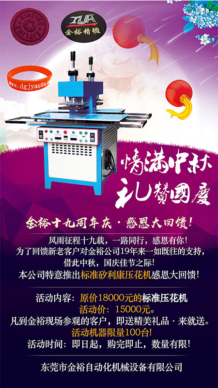 金裕公司為答謝新老客戶對公司的大力支持,本公司特意推出標準矽利康壓花機感恩大回饋!量100臺,售完恢復原價,有需要的客戶朋友抓緊了~,咨詢熱線:13826974368 汪女士