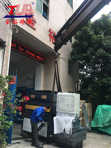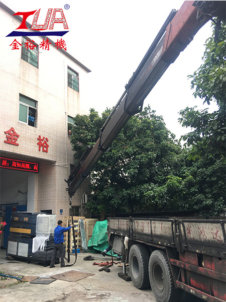 吧,有兩個客戶在開會的時候找到金裕的銷售人員,原來這兩位客戶是從阿里上找到金裕的客戶,是過來看鞋材機現場的,但是這兩個客戶就在現場簡單看了下鞋材機的操作,之后又了解下一些亂七八糟的費用材料交期啊,而且也并沒有看打樣......在后面和客戶聊的時候,客戶講到我已經觀察你們金裕好久了,這次過來我也是真想買,你們給個價格做個合同發給我,現在我有事先走了,然后這個客戶就匆匆走掉了,過來一會客戶就發了一張截圖過來,說是定金已經打到賬戶上了,財務確認收到后,安排車子第二天立馬四工位鞋材機出貨,由于車流量比較大,物流車勉強進的來,但是設備的重量還是擺在那的,于是商討決定用吊車來解決這次鞋材機的出貨問題.客戶那邊也收到了設備,也謝謝客戶這么相信金裕,金裕不會讓相信我們的人失望的!